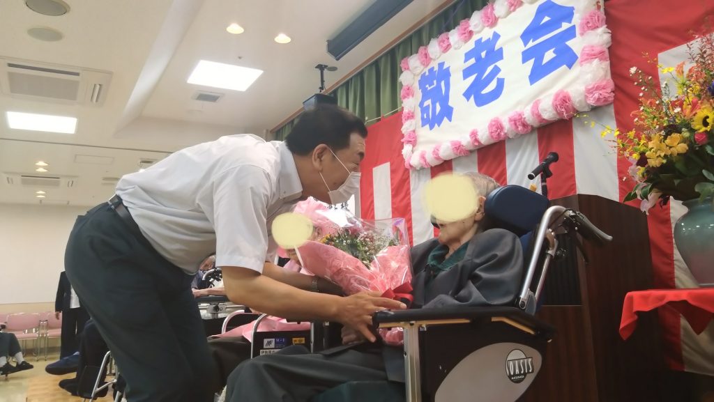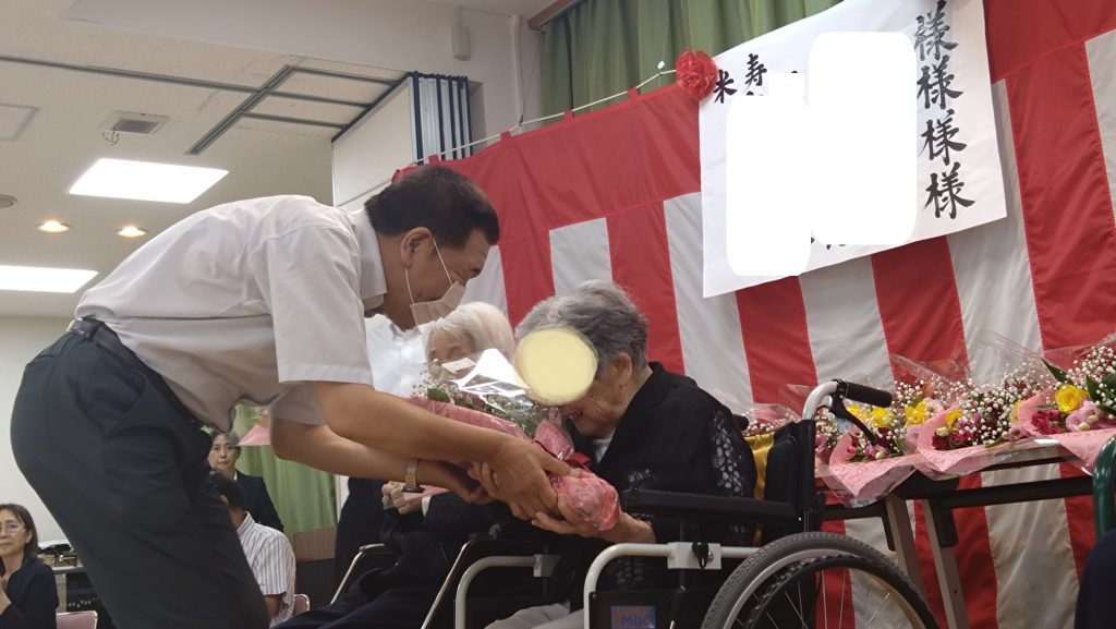今年もホールで式典を執り行いました。今年は米寿4名、白寿1名、百寿2名、百一賀1名、百三賀1名のお祝いを壇上で行う事ができました。