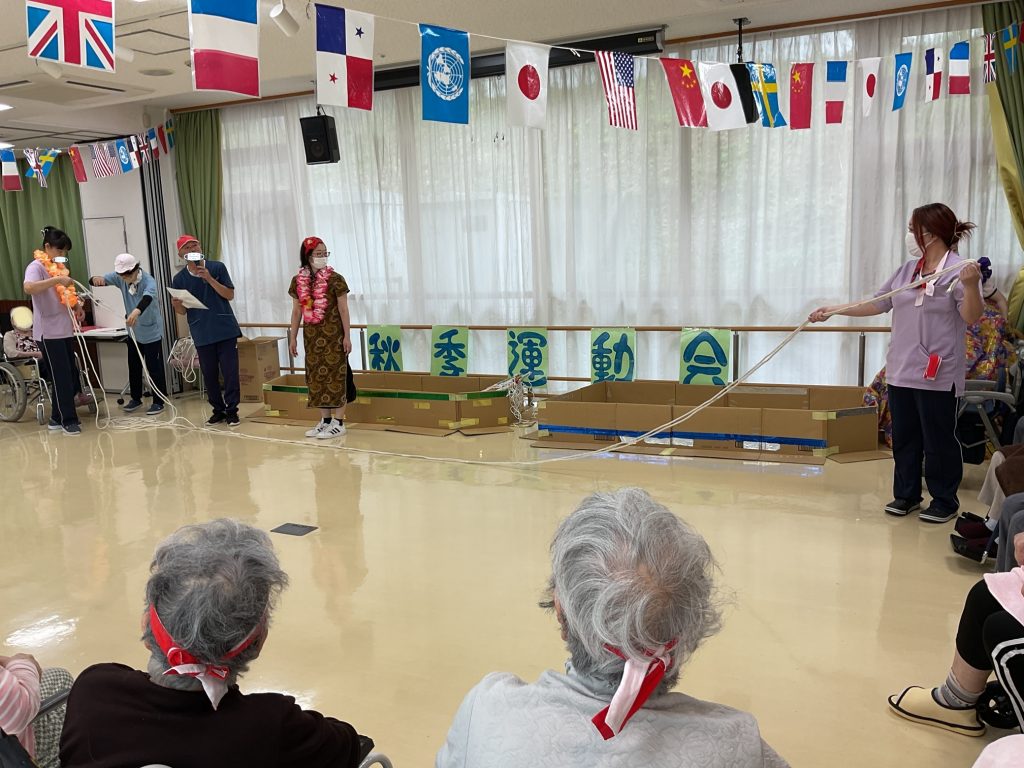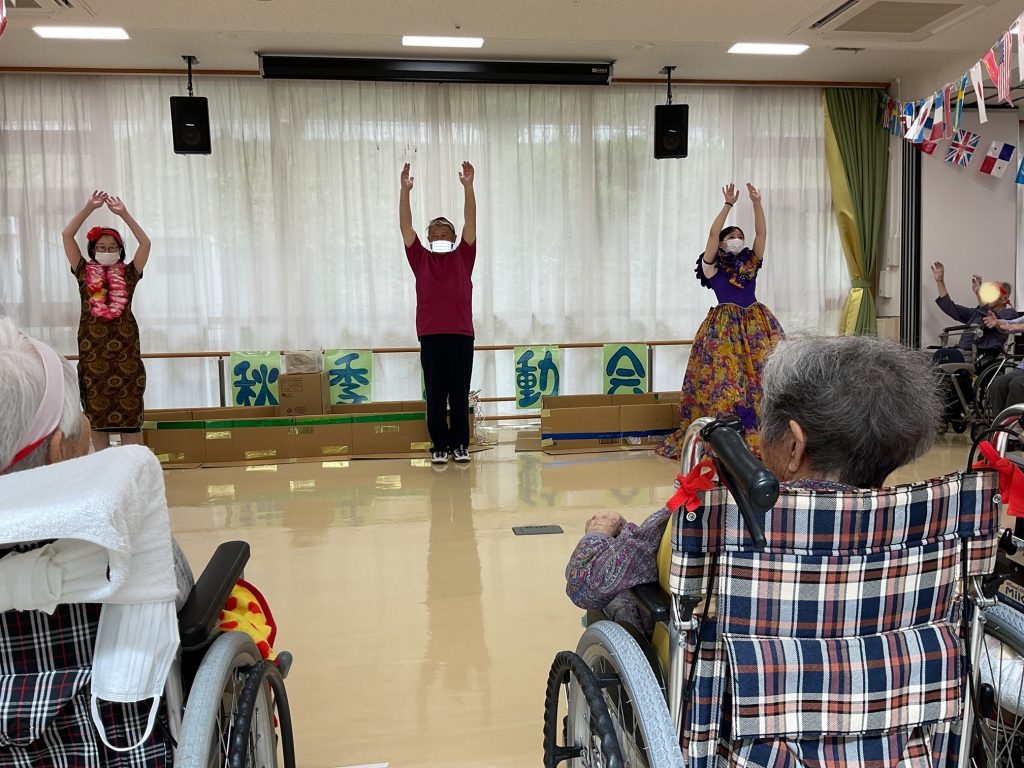 金木犀の香りが漂う中、伊勢原ホームの運動会は今年も外での実施を計画していましたが・・・あいにくの天気予報という事で、施設内ホールで行う事に!